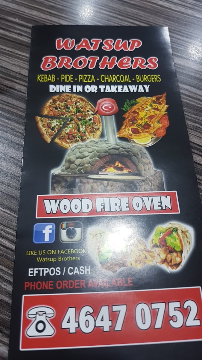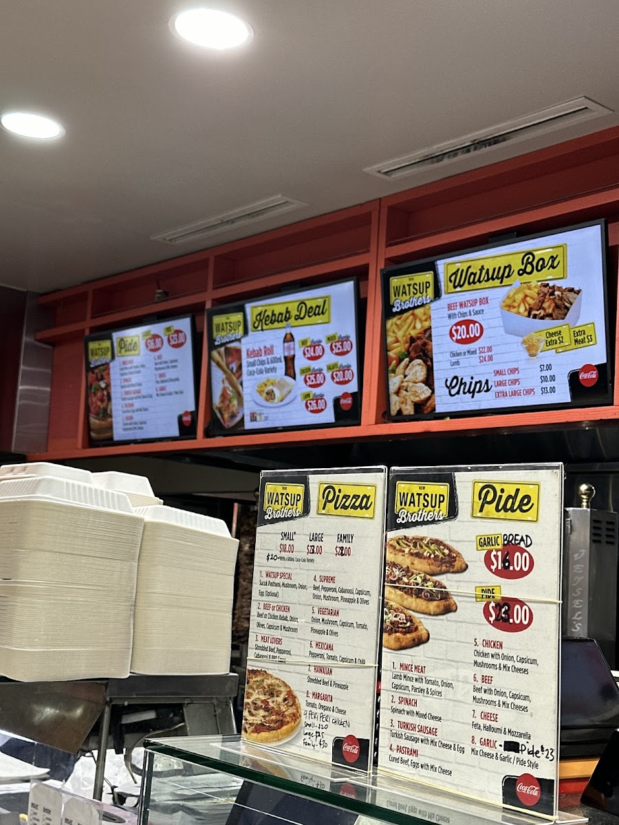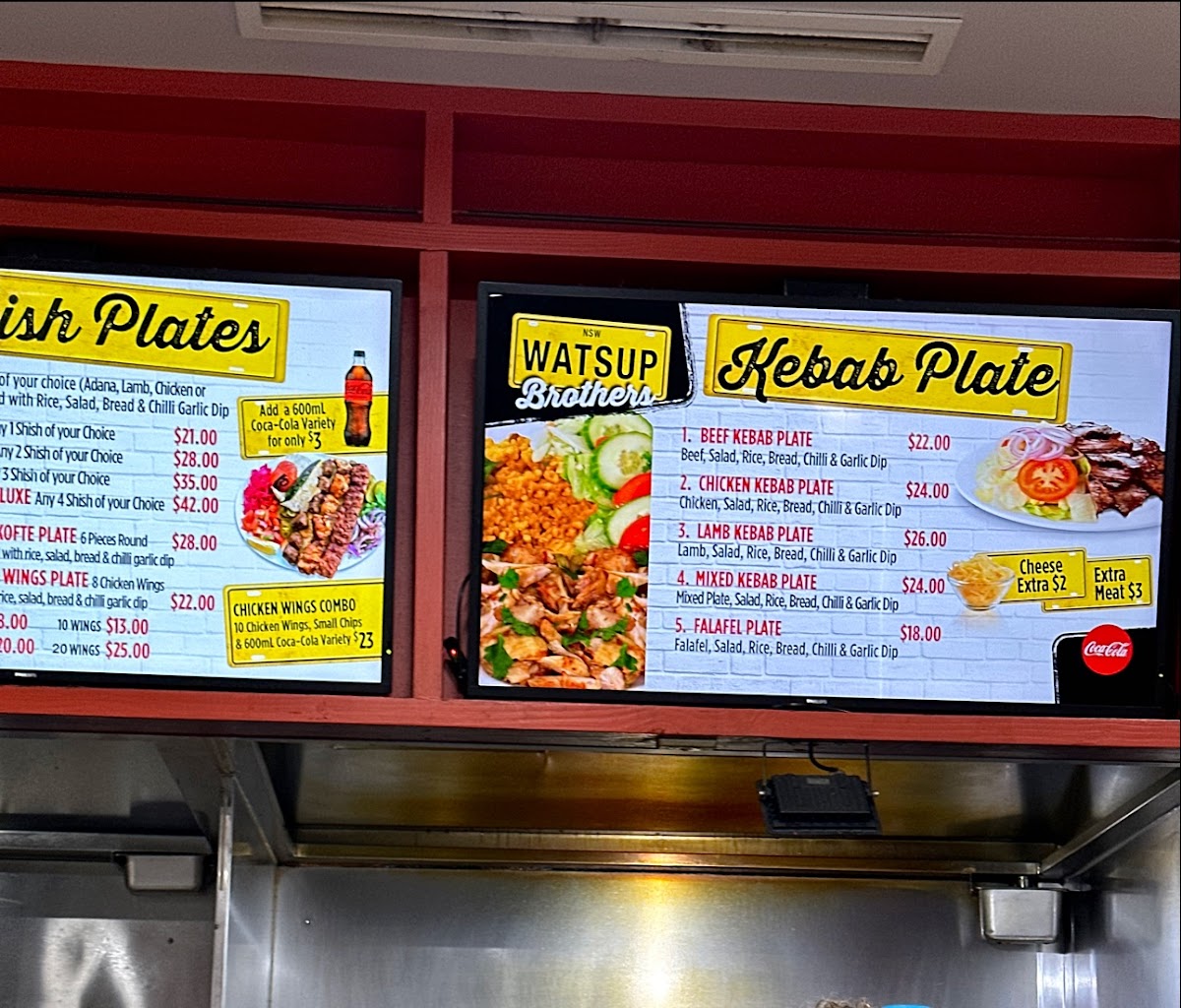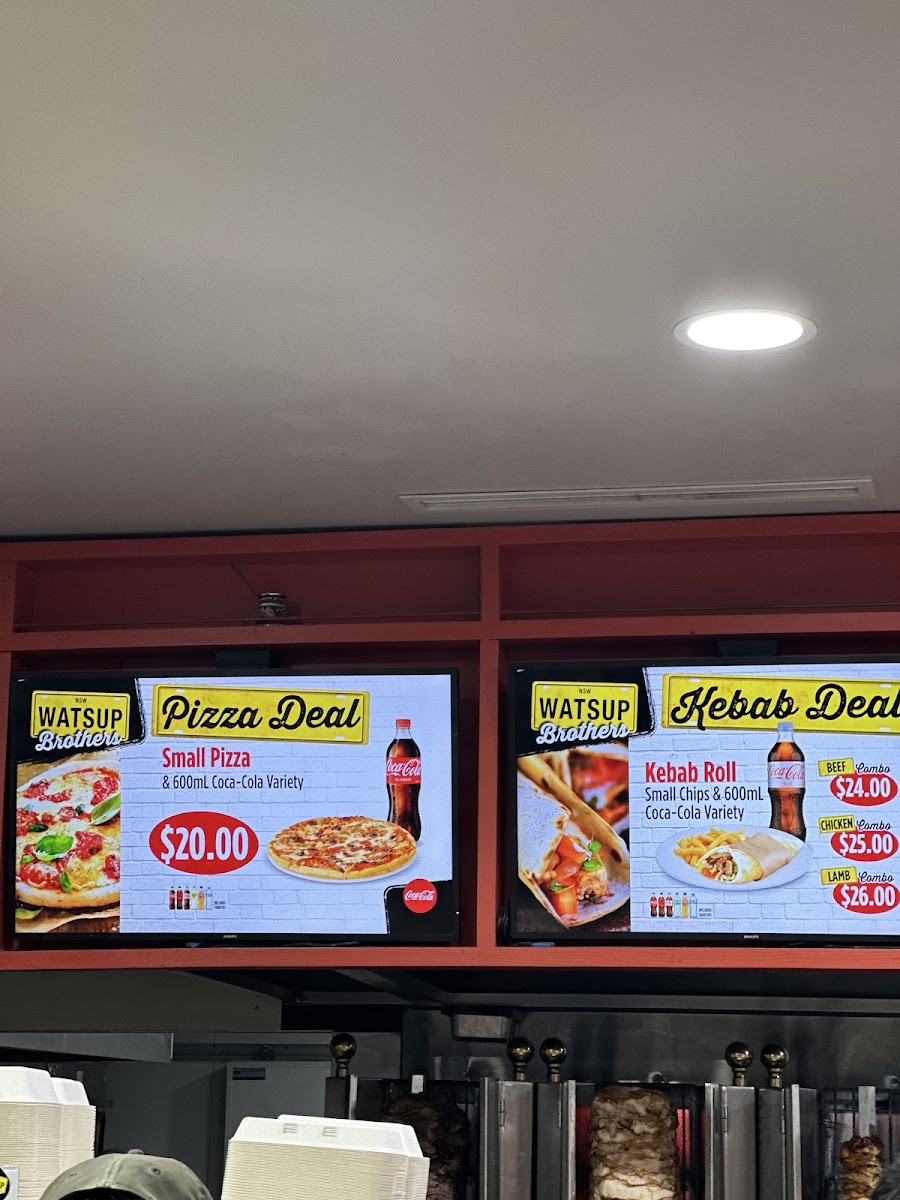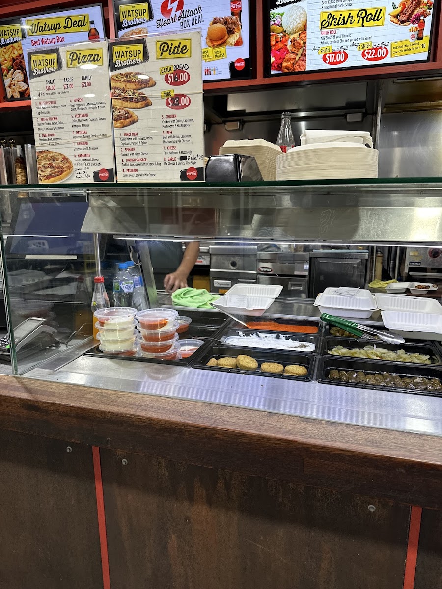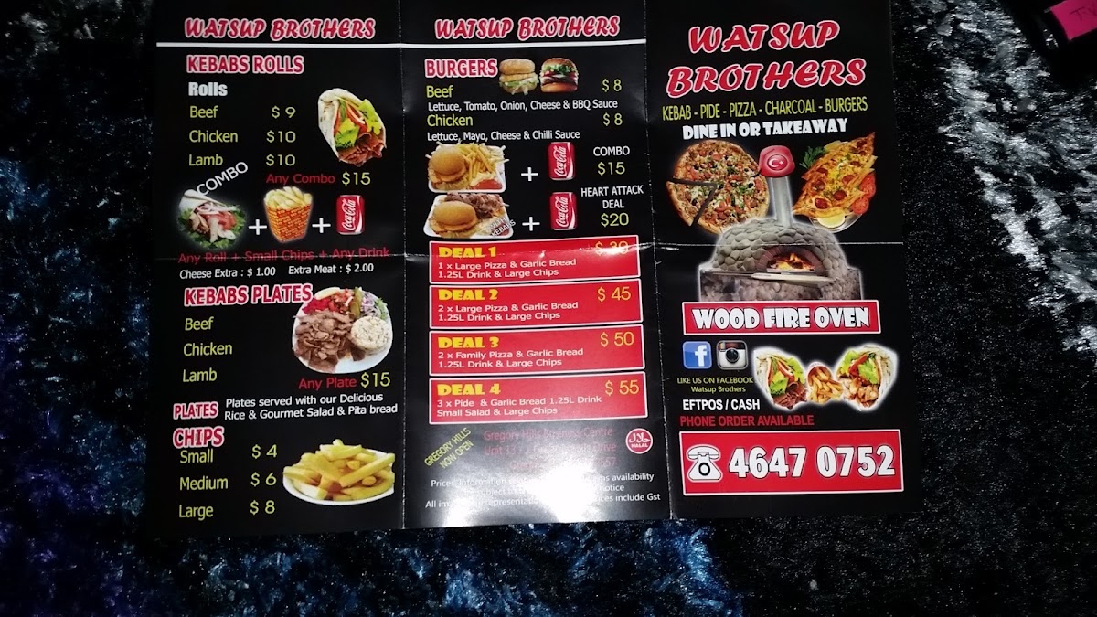 The menu at Watsup Brothers Gregory Hills offers a variety of options primarily focused on kebabs, pizzas, burgers, and fast food items. It is designed to cater to takeout and casual dining needs, providing an accessible selection suitable for quick meals or snacks.
