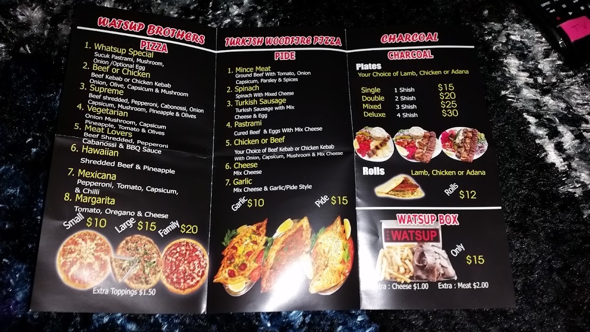 - Pizzas: A range of specialty pizzas are available featuring different toppings such as beef, chicken kebab meat, pepperoni, and various vegetables. Popular varieties include the Watsup Special Pizza, Hawaiian Pizza, BBQ Meat Lovers Pizza, Chicken Pizza, Cheese Pizza, and Pepperoni Pizza.